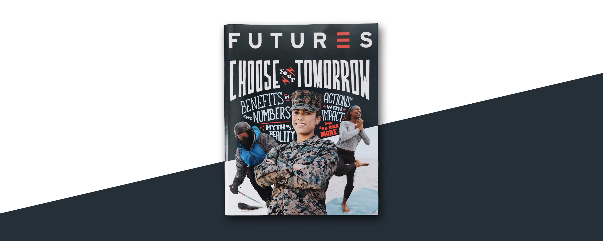 We designed a fully-illustrated, 44-page publication called FUTURES magazine. An annual publication provides an in-depth look into the lives of the people who make up today's military, from careers and education to in-depth stories about how they spend their time off duty.